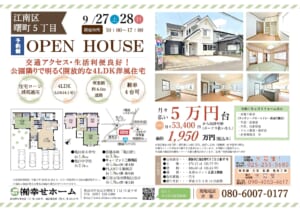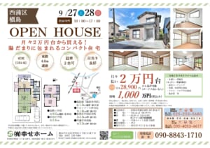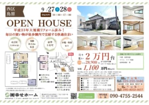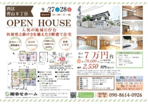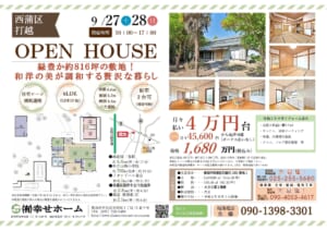 次週末のオープンハウスは、<9/27(土)~9/28(日)>(AM:10:00~PM17:00)2日間の開催予定です。